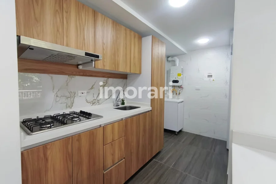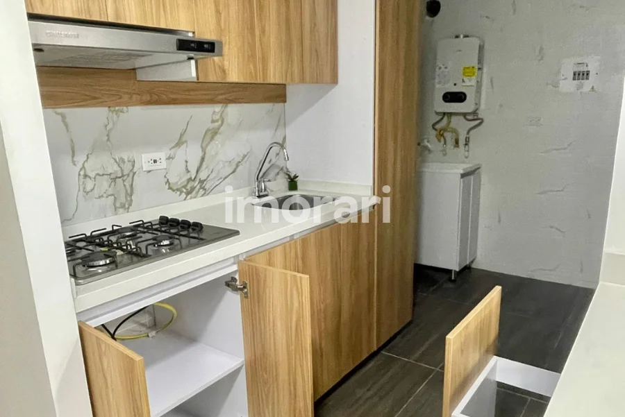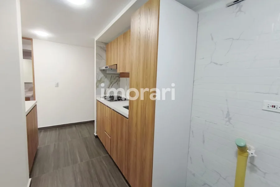La cocina integral está conformada por alacena, estufa empotrada a gas natural, platero, lavaplatos, cajón para residuos, módulos de cajonería funcional y espacio destinado para la ubicación de nevera, ofreciendo comodidad y buen aprovechamiento del espacio.
