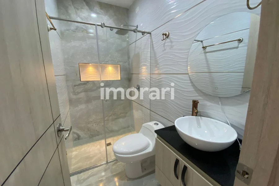 La propiedad tiene aproximadamente 2 años de construcción y se destaca por sus acabados en mármol en pisos y enchapes, brindando un estilo moderno y elegante.