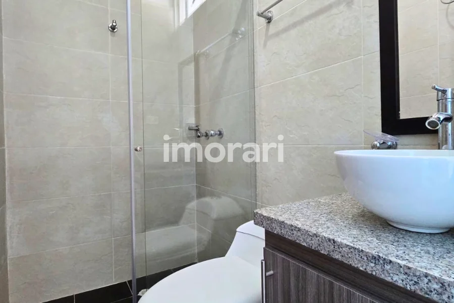 Cuenta con dos habitaciones con clóset, una con baño privado, más baño social. Ofrece sala–comedor amplia, cocina integral con estufa a gas natural, patio de ropas, mirador frontal con hermosa vista y terraza, con opción de construir un cuarto apartamento. El inmueble se encuentra totalmente terminado.