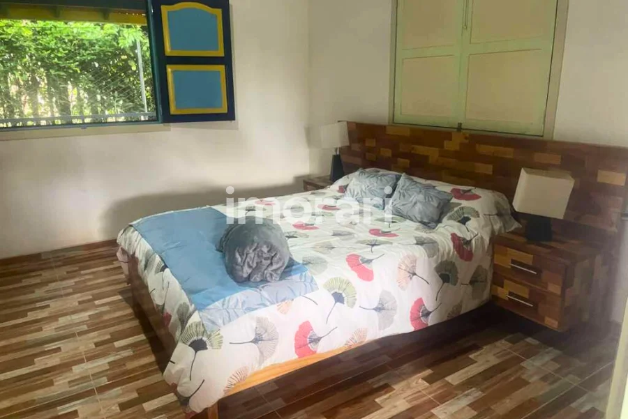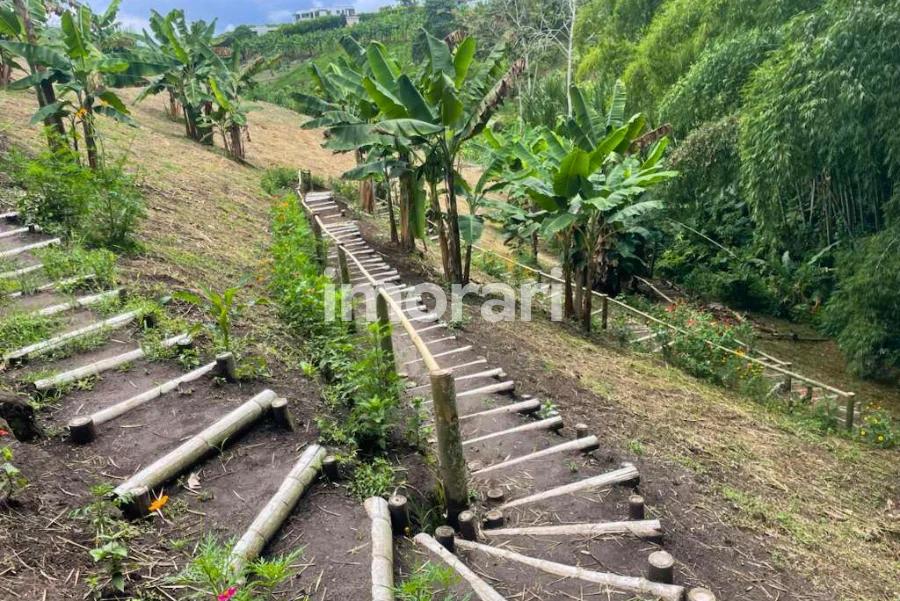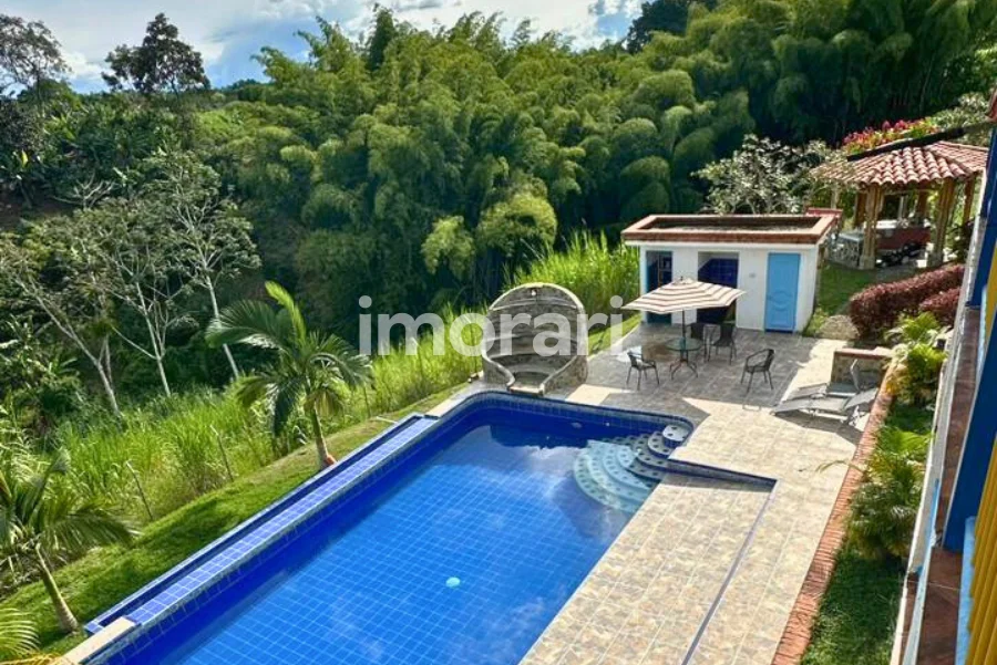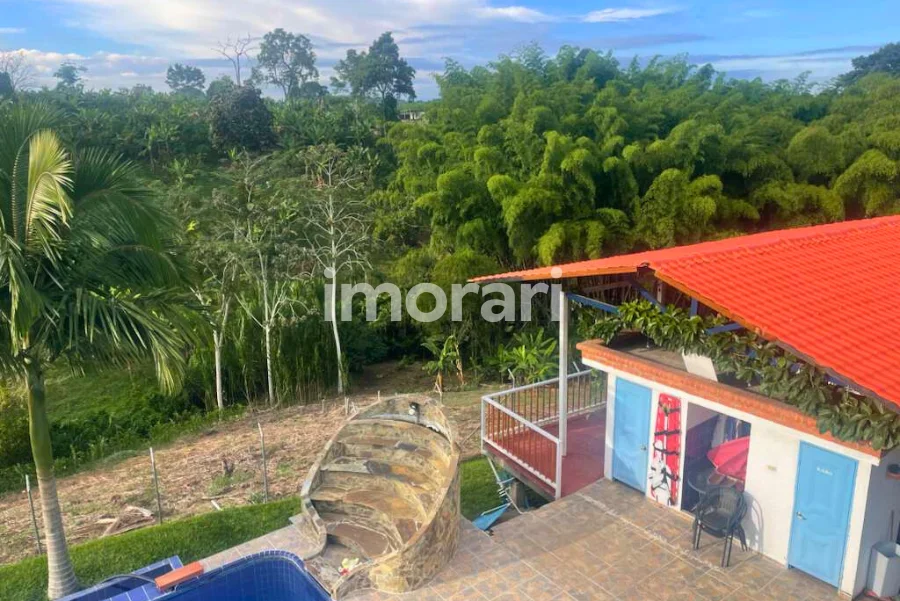 La finca tiene piscina, zona de recreación, sendero peatonal que llega hasta una quebrada y un guadual natural en la parte baja.